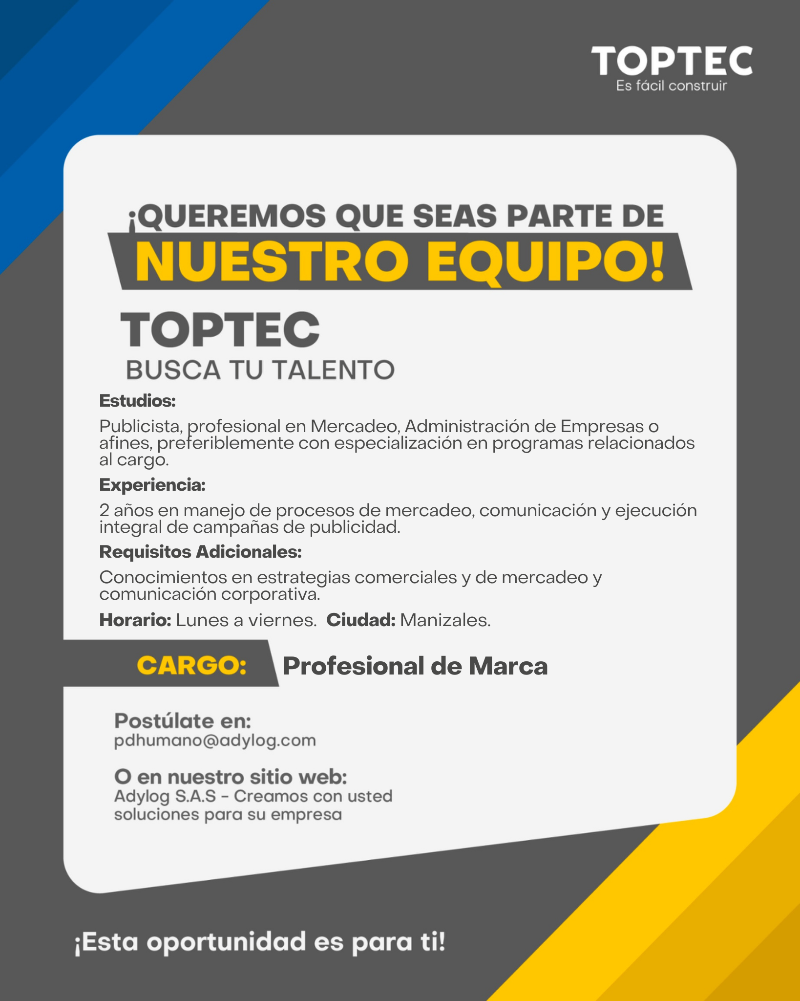 En Toptec S.A. estamos en búsqueda de un(a) Profesional de Marca creativo(a), estratégico(a) y apasionado(a) por el marketing 💡📈, que quiera impulsar el posicionamiento y crecimiento de nuestra marca en el mercado.